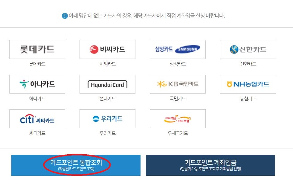 사용하시는 카드사 은행들의 잔여포인트들이 확인가능합니다
